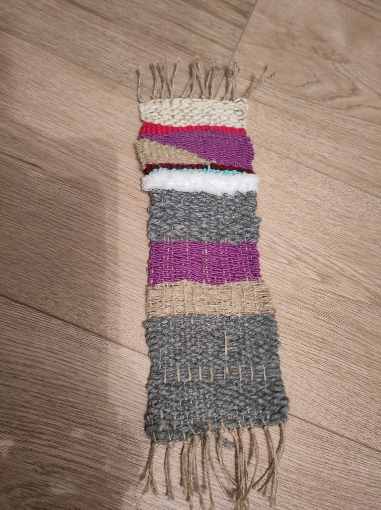Dann wird weiter gewebt, bis der Webrahmen ganz gefüllt ist. Beim Abnehmen vom Webrahmen sieht das Werk dann so aus:
